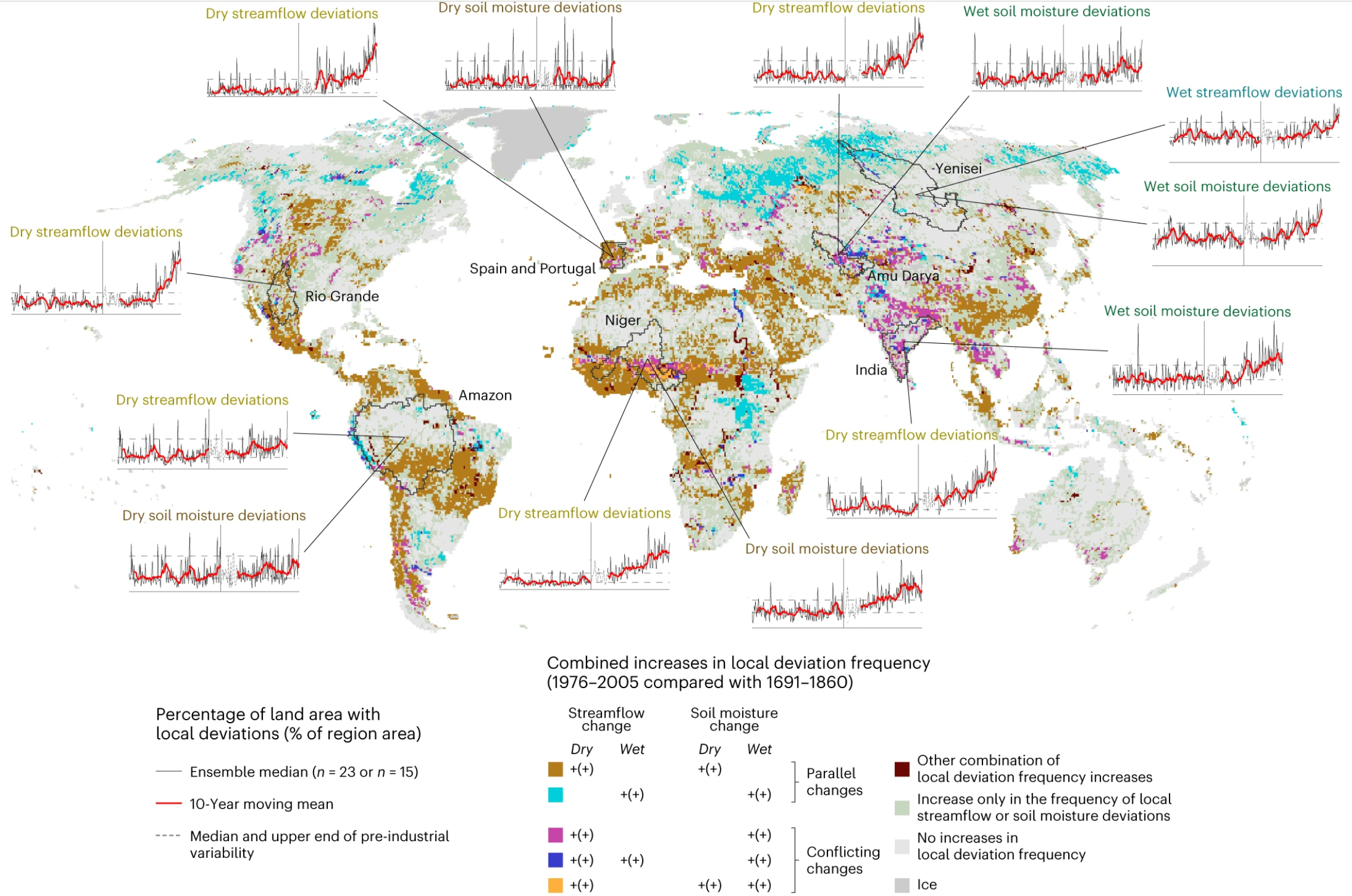 Percentages of land area that have seen deviations from pre-industrial times in streamflow and soil moisture. The graphs highlight examples of the deviations for specific regions. Source: Porkka et al. (2024).